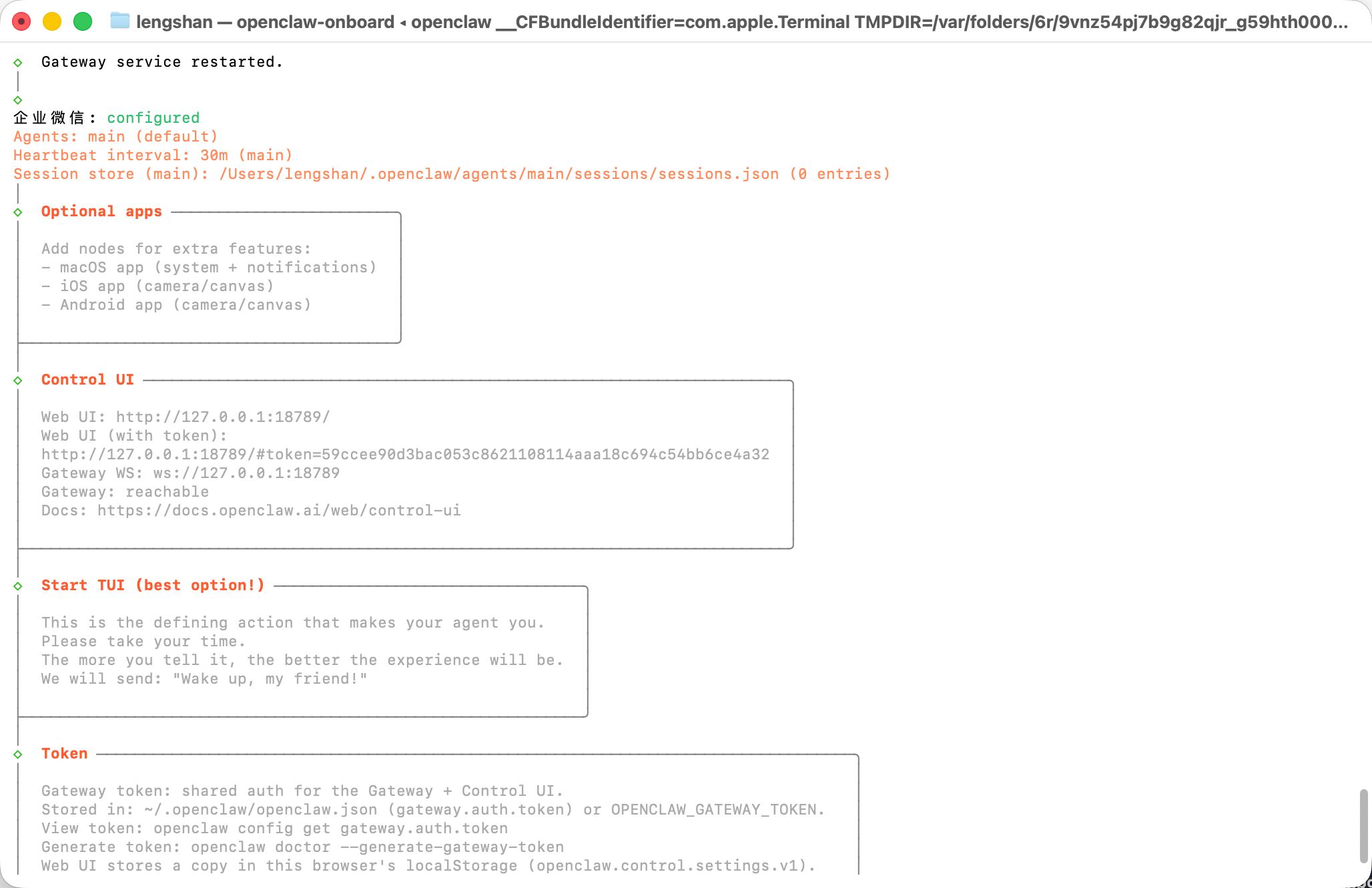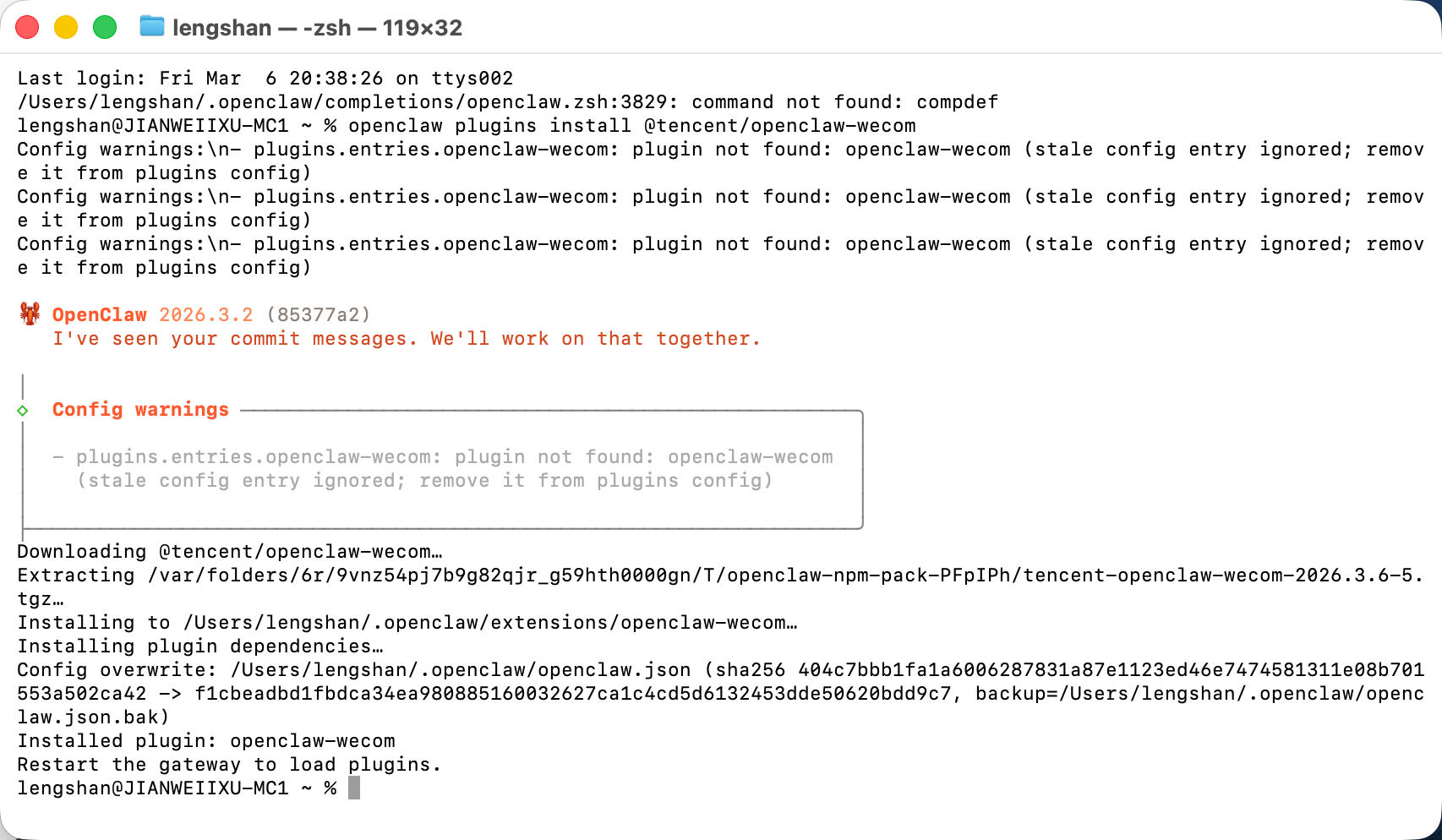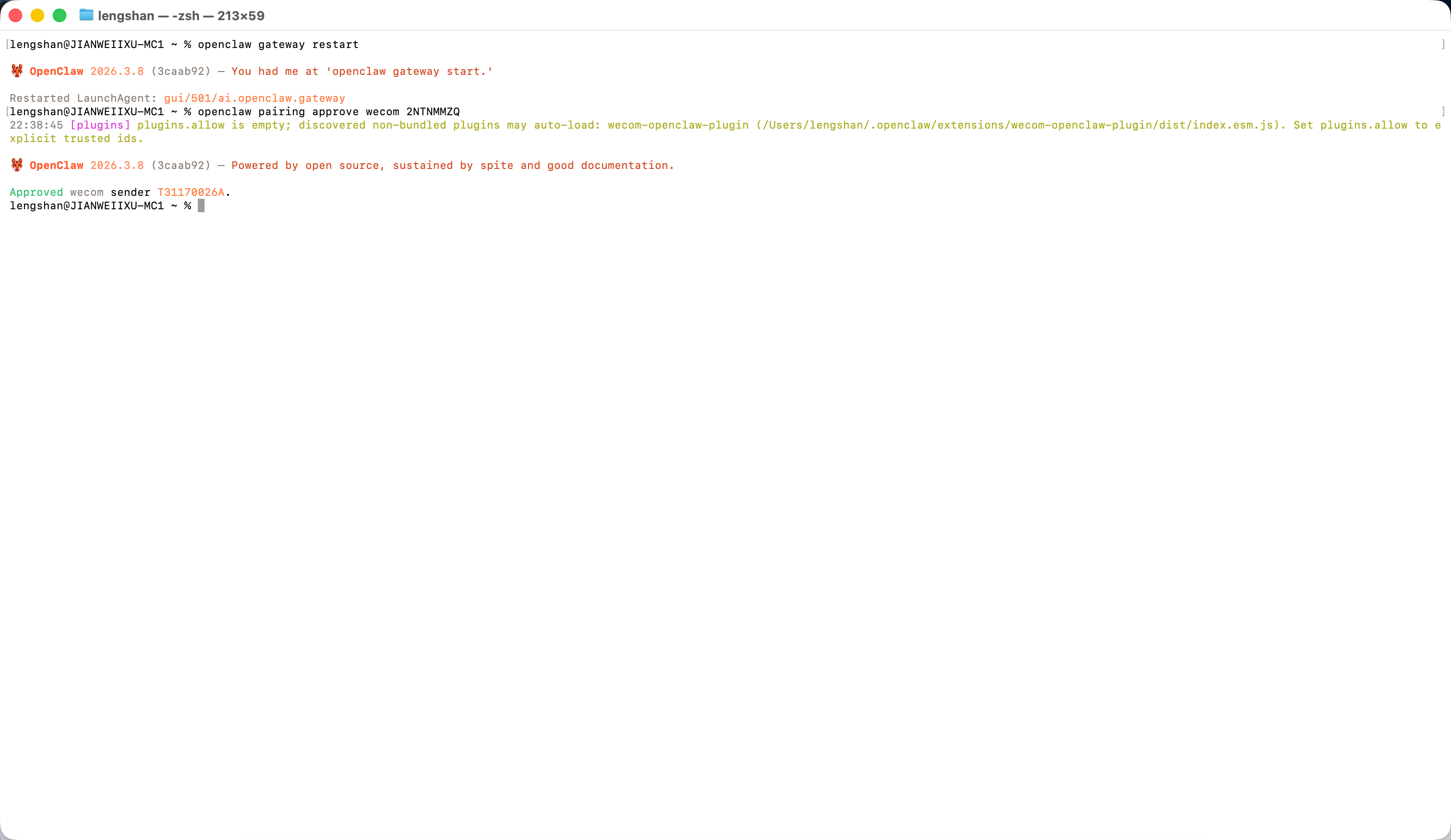 1、以本地部署为例,在本地终端,输入以下命令,安装企微插件。